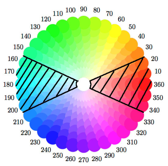 Optical flow angles when represented as an HSV image; the marked areas are the angles of OF that do not trigger slip detection to prevent the deformation of compliant objects from triggering the detection of optical flow.