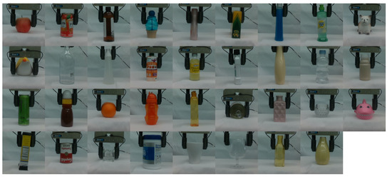 The objects (Figure 9) were subjected to 30 grasping and lifting trials, each with different opening distances, resulting in a total of 1050 image sequences. These image sequences were then labeled to indicate slip or nonslip cases. It is important to note that all objects used in the experiments were within the gripper’s maximum opening distance in size. The gripper was equipped with a 6 × 4 matrix uSkin tactile sensor, and a RealSense D345i RGBd camera was positioned in front of the gripper.