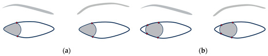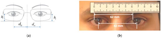 Pupillary distance (PD), defined as the distance between the centers of the two pupils [7], and pupillary height (PH), which refers to the distance from the center of the pupil to the lowest point on the lower rim of the frame measured along the visual axis of the eye passing through the lens, are essential measurement parameters in the fields of ophthalmology and optometry, commonly expressed in millimeters. In Figure 1a, the variables “dlc” and “drc” represent the left and right interpupillary distances, respectively. The sum of these distances is referred to as the total PD. Similarly, “hl” and “hr” represent the left and right pupil heights, respectively. These parameters can be utilized in various aspects, such as optometric fitting, customization of eyeglasses, and vision correction. However, inaccurate measurement of PD or PH, or a mismatch between the optical center of the lens and the PD, can cause distorted, blurred, and ambiguous visual images, leading to visual fatigue and damage to the eyes. There have been numerous studies on the importance of PD, including potential applications in biological characteristics.