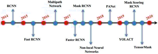 Instance segmentation is a challenging and important area in machine vision research that aims to predict object class labels and pixel-specific object instance masks to localize different classes of object instances in various images. This field has many applications in robotics, autonomous driving, and surveillance. With the advent of deep learning [20], specifically convolutional neural networks (CNNs) [21,22], many instance segmentation frameworks have been proposed, such as Mask R-CNN [23], which uses a fully convolutional network (FCN) [24,25] to predict segmentation masks alongside box regression and object classification. To improve performance, the feature pyramid network (FPN) [26] has been used to extract stage-wise network features, and new datasets such as Microsoft’s COCO dataset [27], the Cityscapes dataset [28], and the Mapillary Vistas Dataset (MVD) [29] have provided opportunities for improving proposed techniques. Network design principles for image classification have also been proposed and are useful for object recognition, including shortening information paths, using dense connections, and increasing information path flexibility and diversity by creating parallel paths. Although there are numerous techniques applied to instance segmentation, notable methods are highlighted in the timeline presented in Figure 2.