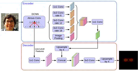 - Chen, L.C.; Zhu, Y.; Papandreou, G.; Schroff, F.; Adam, H. Encoder-decoder with atrous separable convolution for semantic image segmentation. In Proceedings of the European Conference on Computer Vision (ECCV), Munich, Germany, 8–14 September 2018; pp. 801–818. [Google Scholar]