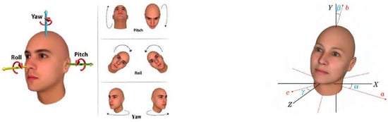 In computer vision, the pose of an object refers to its relative orientation and position in relation to a camera. This pose can be altered by either moving the object with respect to the camera or by moving the camera with respect to the object. In 3D space, the rotation of an object can be represented by three Euler angles (α, β, and γ), where α represents the yaw angle, β represents the roll angle, and γ represents the pitch angle of the head pose, as shown in Figure 7.