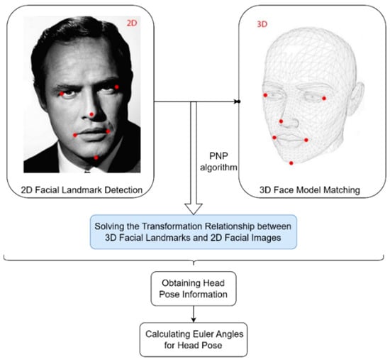 To achieve head pose estimation, the algorithm [37] we adopt generally follows the steps shown in Figure 8. Firstly, an ensemble regression tree algorithm is used to train a model for extracting facial feature positions. These feature positions include key points on the face, such as the eyes, nose, and mouth. Next, the extracted facial feature positions are matched with the corresponding 3D face model, establishing the correspondence between the 3D facial feature points and the 2D facial images. Then, the PNP algorithm in OpenCV is utilized to solve the transformation relationship between the 3D facial feature points and the 2D facial images. Through this transformation relationship, we can obtain information about the head pose. Finally, with the help of rotation matrices, the Euler angles of the head pose can be calculated.