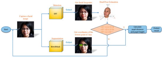 The core of the program consists of two parts: the first part is facial keypoint detection, which aims to obtain the coordinates of the pupils; the second part is to recognize the position and size of the glasses lenses, with the goal of obtaining the coordinates of the lowest point of the lenses. By combining these two parts, the program can calculate the interpupillary distance and the pupil height. Considering the impact of head pose on the results, after obtaining the facial landmarks, we calculate the head pose information and assess whether the Euler angles of the head pose fall within the predefined threshold. If the Euler angles are within the specified threshold, it indicates that the head pose is suitable for measurement, and we can proceed to obtain the measurement results. However, if the Euler angles are outside the threshold range, it indicates that the head pose is not suitable for measurement and we need to retake the facial photo. The flowchart of the entire program can be seen in Figure 9.