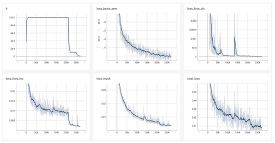 The loss curve provides an intuitive way to assess the training progress and convergence of a neural network. In order to demonstrate the effectiveness of the model in a more intuitive way, this article used the TensorBoard visualization tool to record the details of the model’s learning during the training process and plotted the relationship between iteration number and test set loss, as shown in Figure 12. During the experiment, a total of five loss curves were recorded, including: loss_basis_sem, loss_focs_cls, loss_fcos_loc, loss_mask, and the final total_loss curve. Among them, the loss_focs_cls curve evaluates the model’s classification performance, which can show the specific details of the classification training process. The loss_fcos_loc curve evaluates the degree of position offset of the target detection box, where larger offsets correspond to higher loss values. The loss_mask curve evaluates the effect of pixel-wise segmentation of the image during instance segmentation. The total_loss curve is the sum of loss_basis_sem, loss_focs_cls, loss_fcos_loc, and loss_mask, which can provide a comprehensive evaluation of the overall performance.