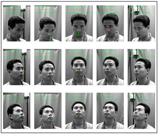 Due to the significant impact of head tilt on the measurement of interpupillary distance and pupil height, we need to determine whether the head is tilted in the images obtained by the user. For this purpose, we have adopted a head pose estimation algorithm based on the conversion of 2D facial landmark points to 3D. We selected 15 different angle photos of an individual, ran the trained head pose estimation algorithm, and then compared the algorithm’s estimated head pose with the actual pose. Experimental results indicate that, in most cases, this algorithm can accurately determine whether the head is tilted in the image and can estimate the tilt angle. The visualization of the head pose estimation process is shown in Figure 14.
