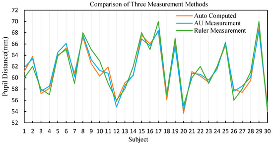 In order to compare the differences among three different measurement methods, we generated a line graph (Figure 15) to plot the data from the three groups. From the graph, it can be observed that there is no significant difference among the data obtained from these three different measurement methods. Additionally, we conducted a repeated measurement variance analysis based on the measured data. Thirty testers used rulers to measure the pupillary distance (), used AU to measure the pupillary distance (), and used the model proposed in this paper to measure the pupillary distance (). The Greenhouse–Geisser correction estimated value for deviation from sphericity is denoted as . Our results indicate that there is no significant difference between the pupillary distance measured using the model proposed in this paper and that measured using rulers or AU, . Therefore, we conclude that the results of using the model proposed in this paper to measure the pupillary distance are accurate.