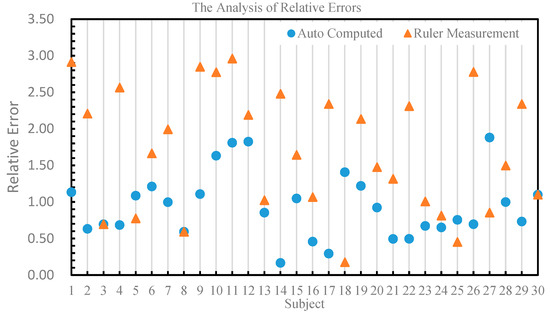 In this experiment, we used the values measured by an auto-refractometer as the standard value and calculated the relative errors between the values calculated by our model and the measurements taken by a ruler as compared to the standard value. In comparison to the values measured by an auto-refractometer, the relative error of the pupil distance calculated by our model was all below 2%, with most being smaller than the relative error of ruler measurements. In contrast, the relative error of some ruler measurements was close to 3%. The specific numerical values are shown in Figure 16. Therefore, using values calculated by our model and those measured by an auto-refractometer is more consistent with a high degree of accuracy compared to the ruler measurements. In experiments conducted in groups 5, 18, 25, and 27, our method exhibited a higher relative error compared to measurements taken with a ruler. After careful analysis, we believe this could be attributed to the following reasons: (1) insufficient lighting resulting in unclear photos with noise, leading to inaccurate pupil localization, while ruler measurements are not affected by image quality issues, and (2) participants may have had tilted heads or averted gazes during photo capture, which introduced errors in our method, although these errors remained within an acceptable range. We have conducted in-depth research into these issues and will address them in our future studies.