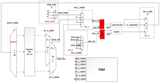 To enable seamless data transfer between various locations within the architecture, three routing networks (RN_1, RN_2, and RN_3) are employed as depicted in Figure 1. The RN_1 and RN_2 include the following three inputs: base coordinates x and y, the output of ROM_DATA, and the outputs of RF_1 and RF_2. The selection of data for processing is controlled by the signals RN_1_ADDR and RN_2_ADDR. The dimension for these control signals is . On the other hand, the input of RN_3 is the output of ALU. Moreover, RN_3 has a size of . It performs a critical role in selecting the desired result produced by the ALU.