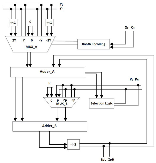 In Equation (4), represents an accumulator, represents the partial product over each iteration, and represents the quotient resulting from the addition result in step 4 of Algorithm 2. The multiplicands and , which are in step 6 of Algorithm 2, are found in after iterations. Booth encoding, as explained in Section 3.5.2, is employed to construct the partial product.