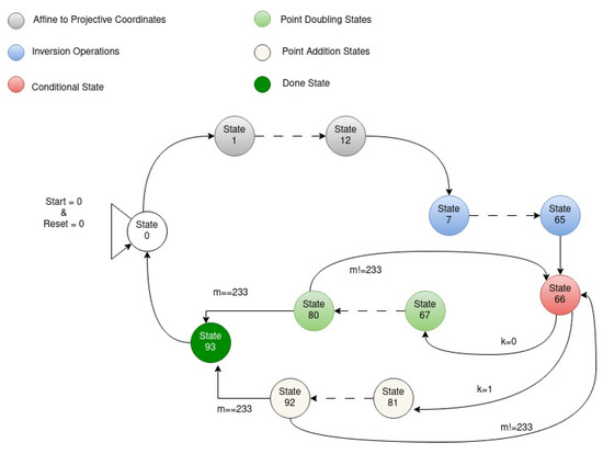 As shown in Figure 3 the control unit starts in an idle state, referred to as State 0. It is triggered by the reset and start control signals. When the start signal is 1, the control unit transitions from the current state to the next state (State 1). In pipelining, the flow from State 1 to State 12 is specifically designed for affine to projective conversions. These control signals facilitate the efficient execution of affine to projective conversions. Furthermore, states 7 to 65 are dedicated to producing signals for the Quad block Itoh–Tsujii inversion operation. State 66 in the FSM is dedicated to counting the number of points on the given BEC using the value of K. If the value of k is 1, State 66 transitions to State 81. On the other hand, if the value of k is not 1, it transitions to State 67.