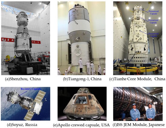 There are many famous manned spacecraft pressurized capsules. In China, these include the reentry capsule and orbital capsule of the Shenzhou manned spacecraft (as shown in Figure 1a), the experimental module of the Tiangong-1 space laboratory (as shown in Figure 1b), and the large column capsule, small column capsule, and node capsule of the Tianhe core module (as shown in Figure 1c); other countries’ include Russia’s Soyuz manned spacecraft reentry capsule and orbital capsule (as shown in Figure 1d), the United States’ Apollo crewed capsule (as shown in Figure 1e) and lunar module, the International Space Station Japanese Experiment Module (JEM) (as shown in Figure 1f), the Columbus experimental module [] and so on.