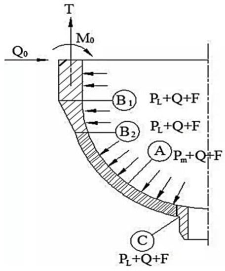 Generally, the ratio of the wall shell thickness t (generally 1–5 mm) of the manned pressurized capsule structure to the minimum curvature radius R (generally more than 1000 mm) of the middle surface is far less than 1, so it can be regarded as the thin-walled shell structure of the pressure vessel. In the pressure vessel design specification, the stress caused by internal pressure load on the thin-walled shell can be divided into primary stress P (divided into primary overall film stress Pm, primary local film stress PL), secondary stress Q and peak stress F. Figure 3 is the stress classification of a typical pressure vessel shell under internal pressure. It can be seen that the stress in the spherical region A is composed of the primary overall film stress Pm, the secondary stress Q and the peak stress F. The stress in the shell connection regions B and C with different shapes is composed of the primary overall film stress PL, the secondary stress Q and the peak stress F. According to the different effects of various stresses on the failure of the pressure vessel structure, the specified allowable stress limit value is calculated and checked according to the corresponding strength theory.