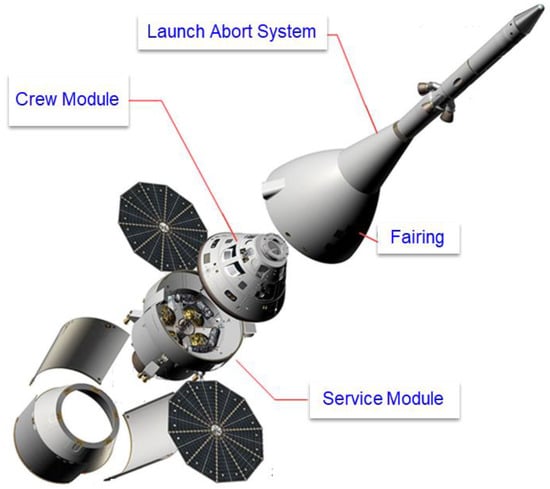 Manned deep space exploration missions refer to extraterrestrial missions targeting the Moon, asteroids, Mars and its satellites, in which human astronauts are directly involved in the exploration. According to the different target celestial bodies for landing, manned deep space exploration can be divided into missions such as manned lunar exploration, manned Mars exploration and so on. Manned lunar exploration is the starting point and foundation of manned deep space exploration, and is a hot spot of international manned deep space exploration [,]. For example, since 2004, the United States has launched the Project Constellation, Artemis and so on to develop spacecraft such as Orion, as shown in Figure 6.