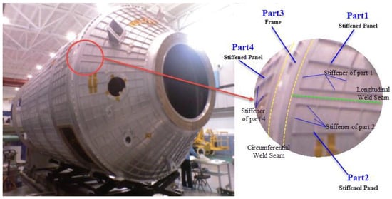 The WPPCS is a whole structure welded by several frames and several panels on the basis of precise control of the dimension of the welding interface. Figure 8 is a typical WPPCS; the typical local structure in the Figure 8 consists of four parts, which are panel 1, panel 2, panel 4 and frame 3. The four parts are connected into a whole structure by welding. The stiffeners of each panel are discontinuous in the weld zone [].