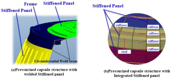 For the pressurized capsules, the internal pressure load is often one of the main loads. In order to withstand internal pressure loads, the outer surface of the pressurized capsule structure is generally designed as spherical, cylindrical, conical and other rotary shapes. According to the different connection forms of the reinforcement parts and the wall shell, the pressurized capsule structure generally adopts the smooth shell structure, the semi-monocoque shell structure (Figure 4a) and the panel structure (as shown in Figure 4b). The reinforcement parts of two kinds of pressurized capsule structure are the partition frame/truss of the semi-monocoque shell structure of Figure 4a and the panel stiffener of the welded panel structure of Figure 4b [,,,,,,,,,]. Among them, the reinforcement parts and the wall shell of the semi-monocoque shell structure are independent parts, which are connected into a whole by riveting, welding and so on. The Multi-Purpose Logistics Module (MPLM) capsule structure strengthens the reinforcement parts and the wall shell as a whole, and there is no need for riveting, screwing, welding and other connections between the two parts.