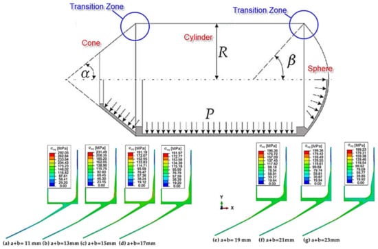 The pressurized capsule configuration is generally composed of a cylinder, a cone and a sphere. Under the action of internal pressure load, the local area of the shape change (shape transition zone) will produce a large stress concentration, as shown in Figure 10. When the internal pressure load reaches a critical value, the stress of these stress concentration areas will quickly approach the yield limit strength of the material. Completely eliminating these stress concentration areas through structural strengthening will cost a lot of weight, which is not conducive to reducing the weight of the structure [,].