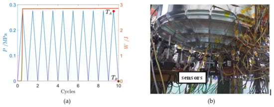 In order to verify the validity of the shakedown numerical analysis method and whether the shakedown limit exists, it is necessary to carry out experimental verification research. To study the shakedown behavior of the structure by experiment, the key is to investigate if residual strain and displacement at all critical locations identified by simulation would stop developing after several load cycles. The design ultimate limit load for the internal pressure is 0.15 MPa, while the calculated stable ultimate limit load is 0.2765 MPa. Therefore, experimental testing will be conducted at the calculated load of 0.2765 MPa. In the study of [], the research object was a pressurized capsule of reduced size. Firstly, the plastic dissipation of the structure gradually converged after 10 times of shakedown limit cyclic loading through the shakedown analysis (as shown in Figure 11a). Secondly, the strain and displacement changes at locations of interest were observed by cyclic internal pressure loading experiments (as shown in Figure 11b). Finally, the numerical analysis was compared with the experimental results. The experimental results show that the structure has attained a shakedown state from the time profile of displacement and strains measured in critical regions.