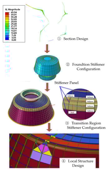 Since the design space of the IPPCS is the global space of the capsule, the structural optimization method plays a more significant role in the design. However, due to the high coupling degree of structural characteristics of the IPPCS, it is not easy or even impossible to carry out global optimization directly for all structural parameters. In order to reduce the difficulty of optimization, following the principle of bottom-up, according to the type of key structural features, the IPPCS design procedure is deconstructed into four steps of shell cross-section, basic stiffener configuration, transition zone stiffener configuration and local structure, and optimized design is carried out at each step.