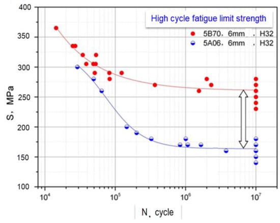 The change of fatigue characteristics was studied by comparing the high-cycle fatigue tests of 5B70 and 5A06. The high-cycle fatigue tests of the two materials were conducted under the same conditions, with both materials in the H32 state with a thickness of 6 mm. The test conditions were set at Kt = 1 and R = 0.1. Under a given life of N = 107 cycles, the median fatigue strength of 5B70 is σ50 = 272 MPa, while the median fatigue strength of 5A06 is σ50 = 160 MPa, as shown in Figure 14. The test data indicate that the fatigue limit of 5B70 has been significantly improved.