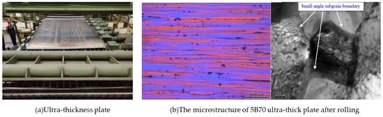It can be seen from the microstructure picture of the sampling of the plate after rolling in Figure 15 that the deformation band structure is evenly distributed along the rolling direction. In the deformed matrix, a large number of dislocations are entangled at the grain boundaries and within the grains to form a large number of dislocation wall interfaces. The dislocation wall within the grains divides the grains into smaller dislocation cell blocks, and the dislocations are rearranged around the cell blocks to form a large number of small-angle subgrain boundaries. This indicates that the deformation matrix of 5B70 mainly undergoes dynamic recovery during the whole rolling process, and no dynamic recrystallization and grain growth occur. The rolling process does not adversely affect the material properties.
