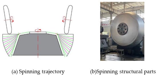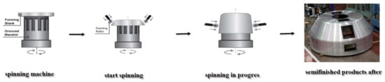 Spinning forming is an advanced plastic forming process with less or no cutting (process principle is shown in Figure 16). This process has been widely used in aerospace and aviation fields because of its advantages of good metal deformation conditions, high material utilization rate and improving product performance [,].