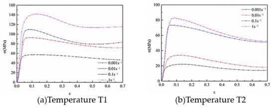 The stress–strain curves corresponding to different strain rates of 5B70 at different temperatures (T1 = 300 °C, T2 = 390 °C) [].