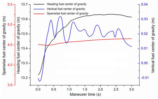 Figure 4 illustrates the changes in the fuel center of gravity in the heading, pitch, and roll directions during the maneuver process. Initially, as the maneuver commences, the acceleration increases abruptly, causing the fuel inside the tank to accumulate in the opposite direction of flight. Consequently, the heading fuel center of gravity undergoes a rapid aft movement. However, after 1.5 s, although the acceleration and pitch angle continue to change, most of the fuel has already filled the rear section of the tank due to its limited volume. As a result, the variation in the heading fuel center of gravity becomes less significant.