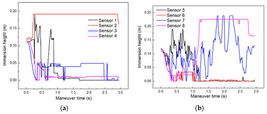 During the maneuvering process, the fluctuations of the fuel free liquid levels monitored by eight sensors are shown in Figure 5. Overall, liquid-level sensors 1–4 detected a relatively calm liquid level, while the liquid level at the location of sensors 5–8 experienced more violent surges and back-and-forth oscillations. The fuel free liquid level motion characteristics at different sensor locations are listed in Table 2.
