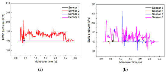 Figure 6 shows the changes in fuel impact pressure monitored by the sensors during the aircraft maneuvering process. It can be seen that the pressure values at the positions of sensors 1, 3, 4, 5, and 6 are relatively stable, indicating that, although there is fluctuation in the liquid level at these positions, the change in impact force is not significant. The pressure oscillation situation monitored by sensors 2, 7, and 8 is more complex. The three pressure curves monitored by sensors 2, 7, and 8 all have multiple peaks, which further indicates the existence of complex free surface phenomena at positions 2, 7, and 8. Although the times when these peaks occur are different, the overall trend is that they gradually decrease with damping.