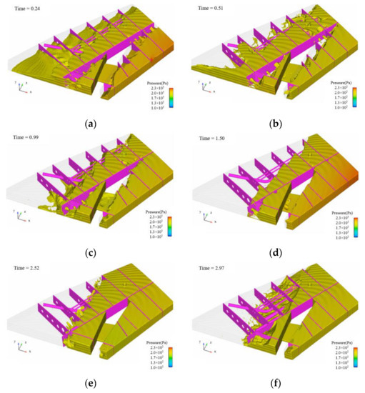 Variation of fuel pressure field in the fuel tank. (a) t = 0.24 s; (b) t = 0.51 s; (c) t = 0.99 s; (d) t = 1.50 s; (e) t = 2.52 s; (f) t = 2.97 s.