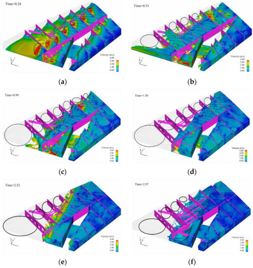 Variation of fuel velocity field in the fuel tank. (a) t = 0.24 s; (b) t = 0.51 s; (c) t = 0.99 s; (d) t = 1.50 s; (e) t = 2.52 s; (f) t = 2.97 s.