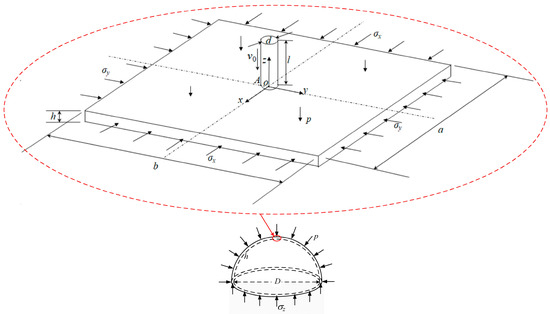 24], in the local size region, the spherical shell surface could be simplified as a relatively flat plate. Then, the spherical shell under concentrative impact loading could be reduced to the plate structure impacted by a projectile. Thus, the proposed structural model is shown in