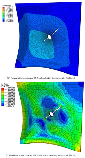 For the structural damage deformation and strain caused by bullet impact penetration on the PMMA block,