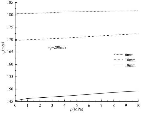 v0 = 200 m/s under different pressures penetrating PMMA square plates with different thicknesses. From this figure, it can be found that, as the external pressure increases, the residual velocity of the bullet also increases, which indicates that the square plate PMMA structure reduces its impact resistance to bullet penetration due to its resistance to the pressure loading.
