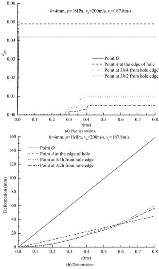 Figure 14 shows the variation history of the structural deformation and plastic strain at different positions during the impact penetration process of the PMMA board with