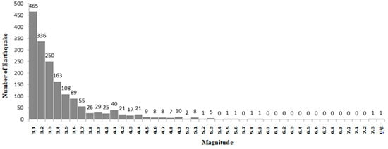 The 33-year histogram distribution highlighting the number corresponding to the size of the earthquake dataset is shown in Figure 1.