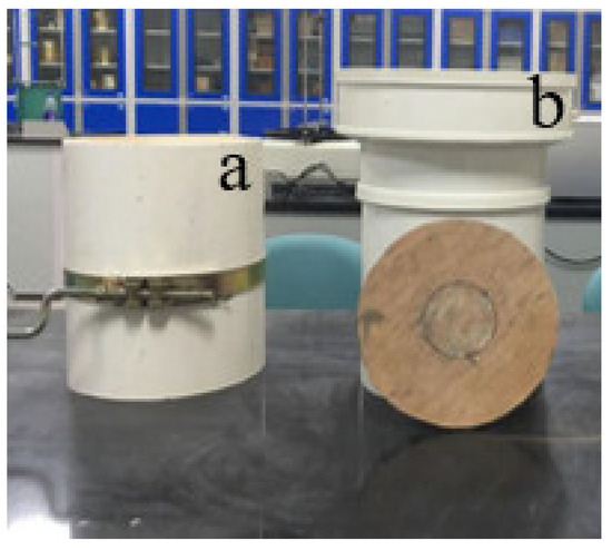 In order to obtain a regular large cylindrical sample, this test was prepared following the three-valve cylindrical cylinder used in the triaxial test sample’s preparation, and a PVC pipe was used as the large sample preparation sleeve. The sleeve’s parts are shown in Figure 2. As observed in Figure 2, a PVC pipe with an inner diameter of 20 cm was used for the sample’s preparation. During sample preparation, the soil mass was placed into the pipe and compacted to obtain a large sample of homogeneous cylindrical soil mass with a diameter of 20 cm. Since the soil of the sample was relatively loose, a board or iron plate with the same diameter of 20 cm was placed at the bottom surface of the upper and lower parts of the casing to ensure the flatness of the bottom surface of the soil. When making the tensile sample, it was also necessary to place a PVC pipe adapter of 20 to 25 cm above the casing (as shown in Figure 2b) in order to create a cylinder with different diameters and to use it as a fixture in the tensile test.