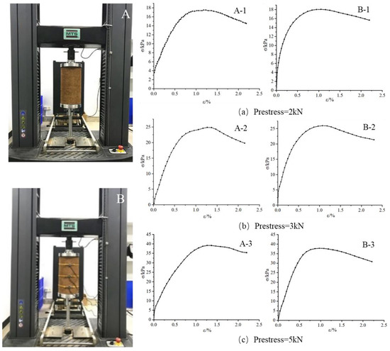 In Figure 5, A-1, A-2, and A-3 are samples without tension strain sensors installed under different compaction loads, while B-1, B-2, and B-3 are samples equipped with tension strain sensors under different compaction loads. By observing the stress–strain curves of the two samples under the same compaction load, it can be observed that whether the tensile strain sensor is installed has little influence on the results of the samples.