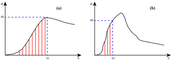 By carrying out a uniaxial compression experiment with loading rate k1, the stress–strain curve can be obtained, as shown in Figure 7a. Meanwhile, transverse strain rate k2 can be obtained using the S-type tension sensor, as shown in Figure 6. Therefore, a tensile test with a strain rate of k2 was designed, and the stress–strain curve was obtained, as shown in Figure 7b. In Figure 7a, the integral before the stress–strain curve reaches its peak in the uniaxial compression test and comprises the operation carried out by axial stresses. In the equivalent tensile test, the integral before the strain that reaches ε2 is the operation carried out by transverse tensile stresses (Figure 7b). Here, ε2 is the transverse strain when the axial strain reaches ε1 in the uniaxial compression test. The operation carried out by internal tensile and axial stresses is substituted into Equation (4) to calculate the stress conversion coefficient.