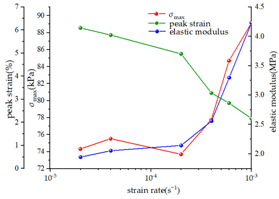 With the increase in strain rate, the peak strength also shows an increasing trend. However, the relationship between the peak strength and strain rate is nonlinear. When the strain rate is less than 2 × 10−4, the peak strength exhibits little change with respect to the strain rate. However, when the strain rate is greater than 2 × 10−4, the peak strength increases obviously with an increase in strain rate. This phenomenon is similar to the test results obtained by Li et al. [8] in rock samples. It can be considered that the peak strength of soil also increases with an increase in strain rate. When the loading rate is within a low range, the compressive stress of soil samples is equivalent to static stress, and an increase in the loading rate has no obvious influence on the mechanical properties of soil. In this range, static loading tests are carried out on the samples. When the loading rate exceeds the range of the static loading test, the compressive stress on the soil mass can no longer be regarded as static stress. The influence of the loading rate on the mechanical properties of the sample begins to show. At this time, the peak strength of the soil mass gradually increases with an increase in the loading rate.