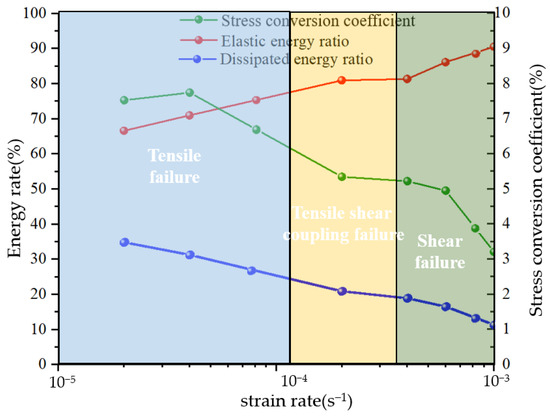 The variation characteristics of soil samples are different with respect to different loading rate intervals. The mechanical properties of soil samples change little with respect to the loading rate during static loading intervals. In the dynamic loading interval, with an increase in loading rate, the peak stress and elastic modulus also increase, and the peak strain decreases. In the axial stress–strain curve, the peak is forward-facing, the pre-peak stress section becomes steeper, and the peak value increases. As observed in Figure 10, with a constant increase in strain rate, the stress conversion coefficient decreases gradually. When the strain rate is less than 4 × 10−5, the failure mode comprises tensile failure, and when the strain rate is greater than 6 × 10−4, the failure mode comprises shear failure.