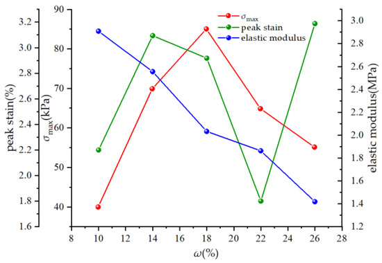 For the convenience of analysis, the average peak strength, peak strain, and elastic modulus measured using five groups of soil bodies with different water contents are sorted, and the obtained data are shown in Figure 11.