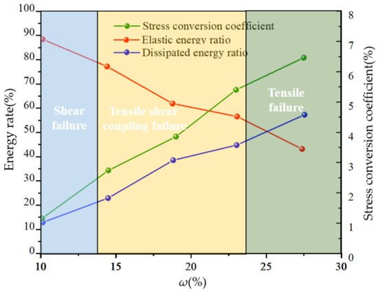 For the convenience of analysis, the average elastic energy, elastic energy ratio, and stress conversion coefficient measured using five groups of soil bodies with different water contents are sorted, and the data obtained are shown in Figure 12. As observed in Figure 12, with an increase in soil moisture content, the proportion of elastic properties decreases, and the proportion of dissipated energy increases in the soil compression failure process. This indicates that the soil with higher water content experiences more plastic deformations during the failure process, and the mechanical properties of the soil obviously change from being brittle to plastic. Therefore, the water content has a significant effect on the mechanical properties of soil. The higher the water content, the more obvious the plasticity of the soil.