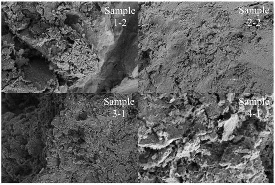 The particle structure of each sample can be directly observed using SEM. Sample 1-2 and Sample 2-2, respectively, show changes in the vertical microstructure of the soil mass before and after compaction. As observed in Sample 1-2, the soil particles are relatively loose before compaction, and cracks with large spacing appear. In Sample 1-2, soil particles at different heights are closely combined after the soil has undergone a complete process of compression failure. With the invasion and extrusion of soil particles during the process of compression failure, it can be observed that the long axis of soil particles is horizontally arranged along the central crack.