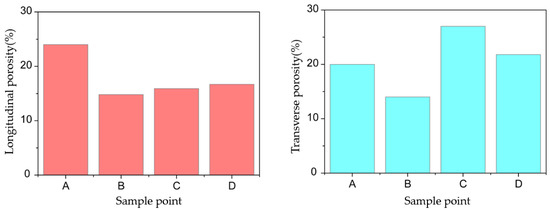 As observed in the bar chart, the longitudinal porosity of soil decreases after compression. The longitudinal porosity of soil samples at different locations is also different. As observed in Figure 15, the longitudinal porosity at point A is the highest among different positions of the soil mass. This is because point A, as the control group, was sampled before the soil mass was compressed, and its longitudinal compression degree was low; thus, its porosity is the highest. At three sampling points B, C, and D, the difference in longitudinal porosities is small, and the degree of longitudinal compaction is similar.
