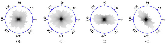 In the process of soil deformation under compression, soil particles squeeze and migrate with each other under the action of tensile stress or shear stress, which leads to the movement or rotation of solid particles and pores. By studying the arrangement characteristics of pores and solid particles before and after the soil is compressed, the motion law of soil particles in the process of soil compression can be obtained. Next, the orientation parameters of soil particles are analyzed and discussed, and the structural characteristics of soil after compression are analyzed. The statistical results of the granular rose map in the longitudinal profile of each sampling point are shown in Figure 16.