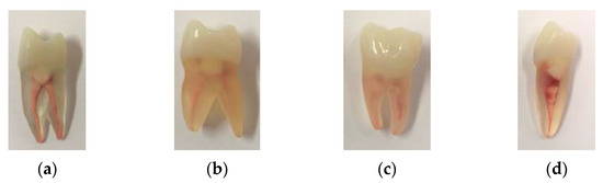 In this study, we used four root canal training models with different root canal morphologies, including maxillary first premolar (FDI, #24), maxillary first molar (FDI, #26), mandibular first premolar (FDI, #36), and mandibular first molar (FDI, #44) (provided by NISSIN, Tokyo, Japan (Figure 1)). All models were tested after completion of the pulp chamber access from the coronal side. The tooth models were acquired using a head X-ray CT unit, i.e., a 3D Accuitomo (3DAccuitomo; J Morita Mfg. Corp., Kyoto, Japan). Imaging was performed in a 360° diameter area of 4 cm × 4 cm, which was the most accurate condition. To minimize artifacts on the tooth models, the imaging was performed with a tube voltage of 70 kV and a tube current of 5 mA, and the data were output as DICOM files.
