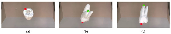 The OBJ data of the tooth, displayed as a 3D model in SRD, allows for the easy manipulation of movement, scaling, and rotation with the mouse, thus enabling linear distance measurements with “SR View for Endo” (Figure 2). In this study, the experiment was purposely conducted in the opaque setting, because the measurer needed to arbitrarily select on the surface of the 3D model. With “SR View for Endo” it is possible to select any surface of the displayed 3D model and to set measurement reference points on this surface. By placing two arbitrary points on the surface of the 3D model, the linear distance between these two points is displayed. The actual measurement technique with SRD was performed according to the following steps: the “SR View for Endo” application was initiated. To avoid bias during evaluation, the measured values were hidden by pressing the “P” key. Tooth models were selected using the “Space” key. The display could be manipulated to any position, angle, and size by using the mouse. After adjusting the size and angle of the 3D model, the first reference point was set by right-clicking. Then, the angle was readjusted, and the second reference point was set by another right click. After setting the two reference points, the measurement value was displayed and recorded. This operation was performed for each tooth model, and the order of display for the tooth models was randomized.