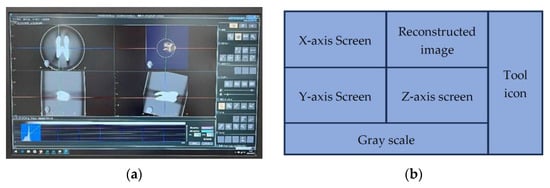 The traditional 2D device is an application that displays 3D models on a regular PC display. Measurements with the 2D device involve displaying four screens: X-axis, Y-axis, Z-axis, and reconstructed image (Figure 3). The actual measurements with the 2D device were performed using the following procedure. To display the slice planes of the first and second reference points on the X-axis screen and the Z-axis screen of the 2D device screen, the slice planes on the X-axis screen or the Z-axis screen were adjusted, and the other axis screen was fine-tuned. The accuracy of the measurement position was confirmed, and the first and second reference points were set by selecting the tool icons. The measurement values were then displayed and recorded. This operation was performed on each dental model, and the display order of the dental models was randomized.